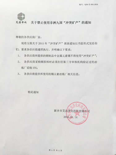 關于禁止使用非洲九國沖突礦產(chǎn)的通知 我公司提出關于禁止使用非洲九國沖突礦產(chǎn)的通知,請各供應商嚴格按照要求實施!